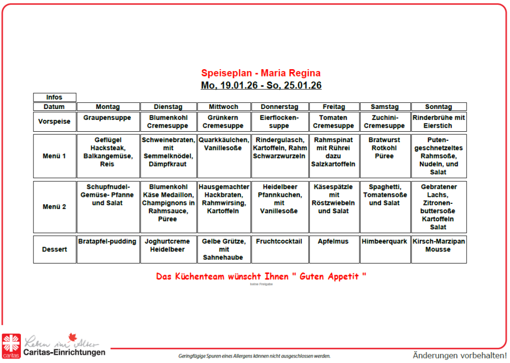 Für die kommende Woche geben wir Ihnen gerne einen Einblick in unseren Speiseplan.