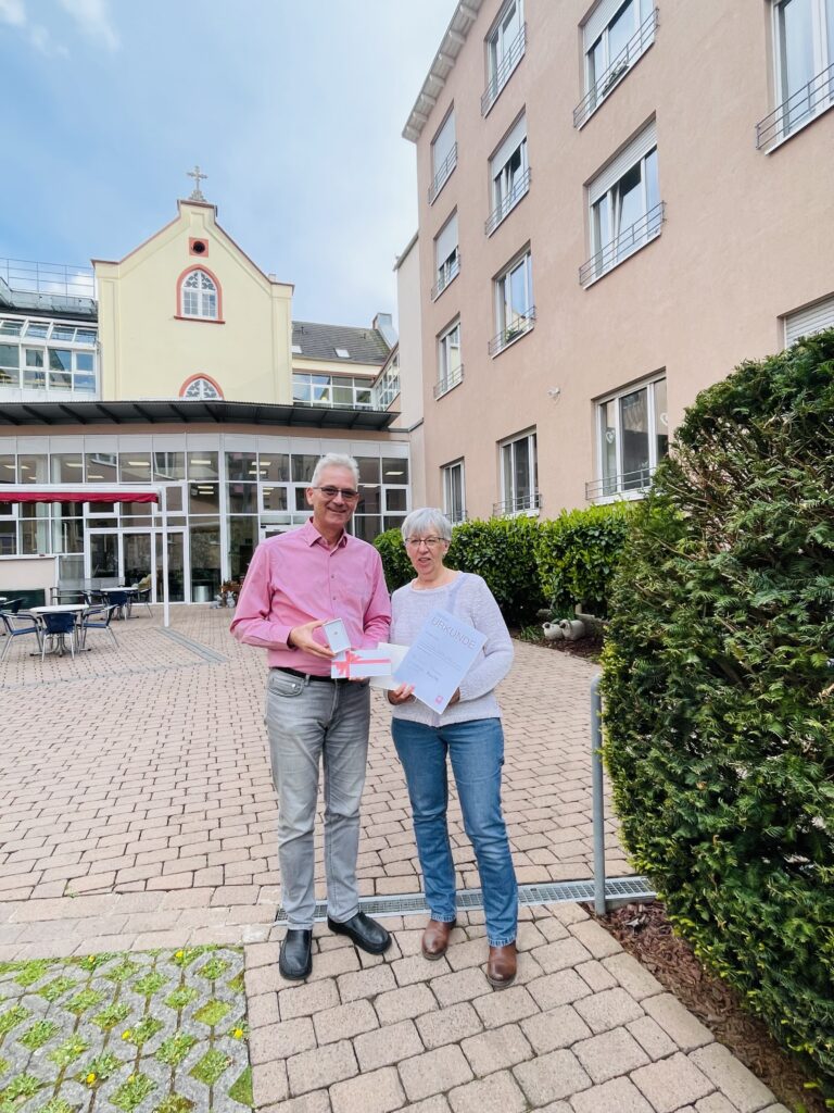 Aus privaten Gründen nahm unsere Sr. Dagmar ihre Anerkennung mit herzlichen Dankesworten für ihren langjährigen Dienst und mit den besten Wünschen für ihren wohlverdienten Ruhestand erst zum jetzigen Zeitpunkt entgegen. Mit einem Los der ‚Aktion Mensch‘ und einem süßen Gruß überreichte unser Einrichtungsleiter Matthias Schiller dies im Namen des Hauses Maria Regina.