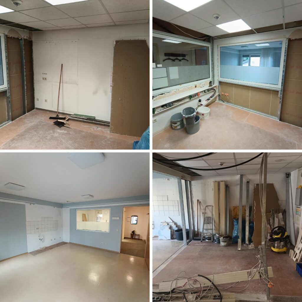Nachdem der Pflegestützpunkt „aufgelöst“ wurde, wurden bereits die vorhandenen Büromöbel abmontiert, die an anderer Stelle im Haus wieder montiert und genutzt werden, und die Trockenwände wurden teilgeöffnet.
