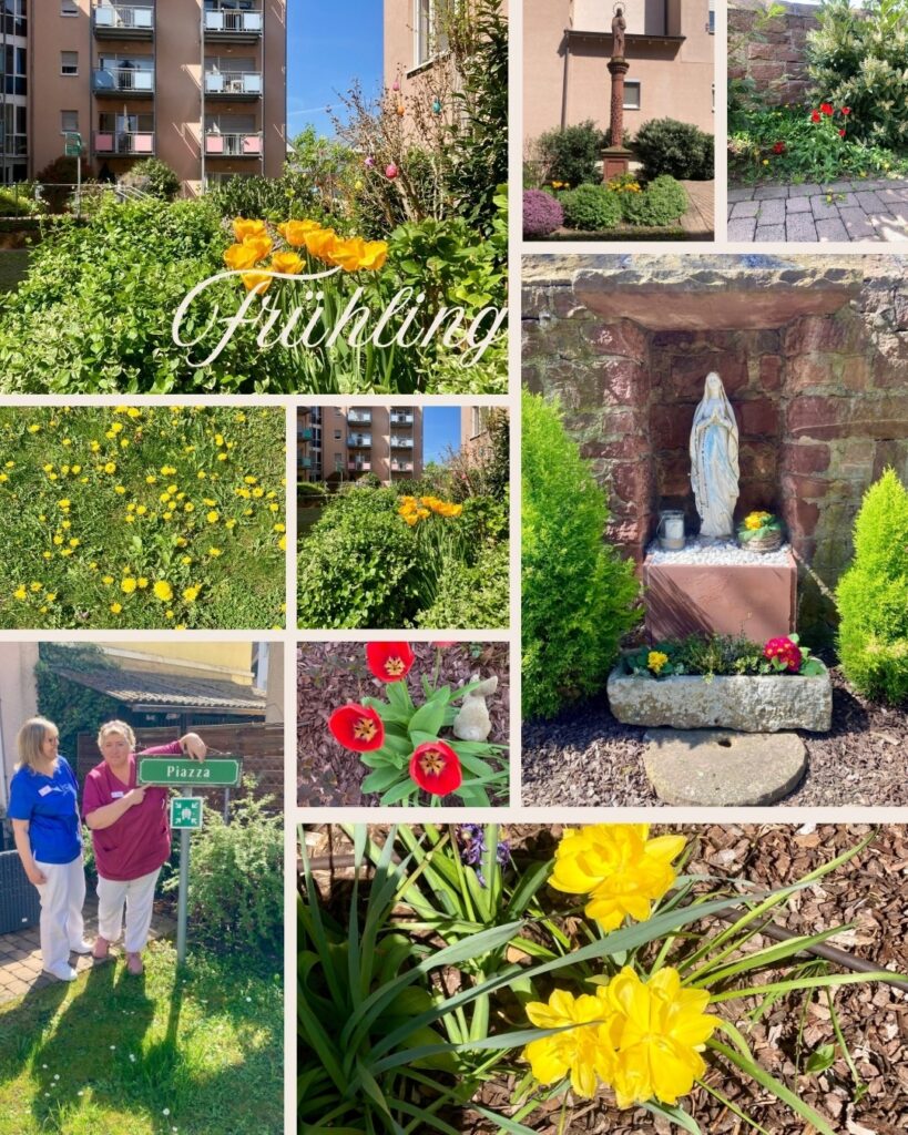 Viele Frühlingsblumen in kräftigen Farben finden wir zur Zeit in Sandsteintrögen, Blumenbeeten und auf unserer Grünfläche rund um unser Haus. Die Sonne zeigt sich auch mit vielen Sonnenstunden und so verweilen unsere Bewohner und auch die Mitarbeiter in ihrer Pause gerne im Pavillon oder im Innenhof.
