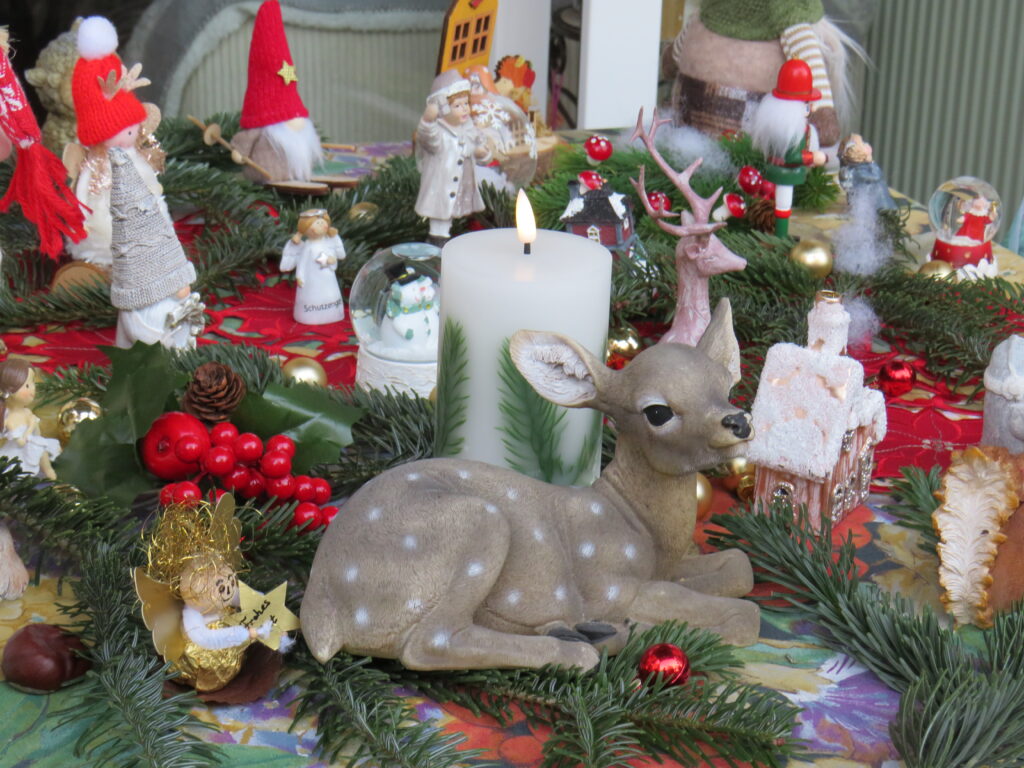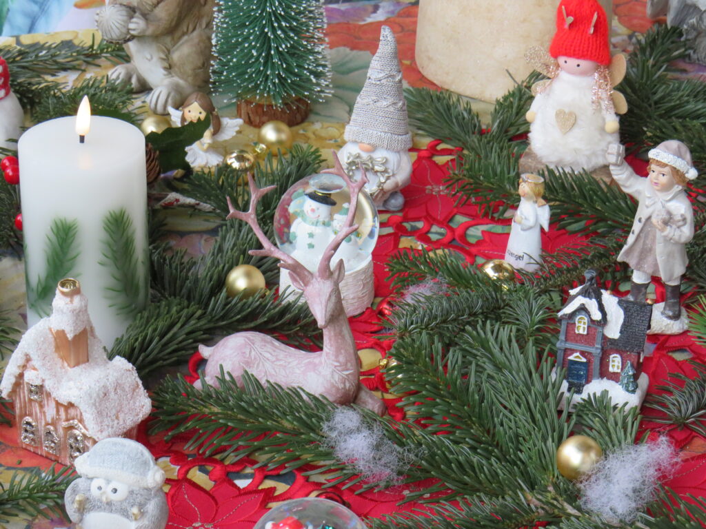 Verschiedene Schneemänner, Wichtel, Engel, Waldtiere und schneeverhangene Häuschen, eingebettet in duftenden, grünen Tannenzweigen zaubern einen echten Hingucker.