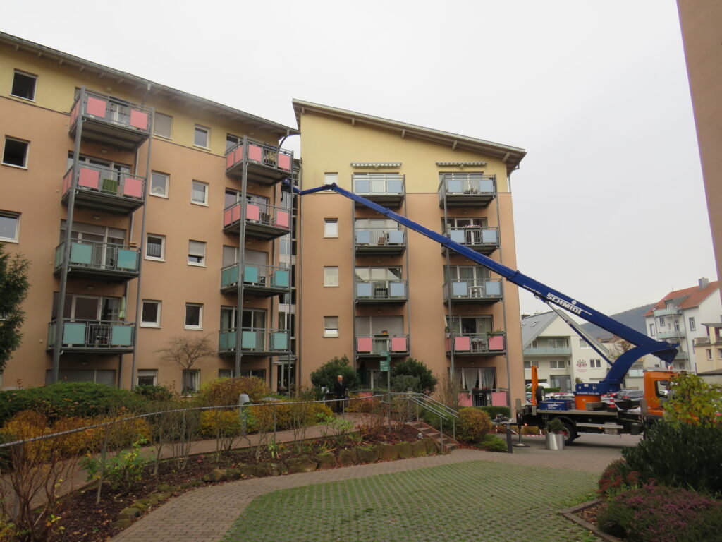 Die große Fensterfront des Treppenhauses im Servicewohnen stellte eine beachtliche Glasfläche dar, die nur mit Hilfe eines Staigers‘ gereinigt werden konnte.