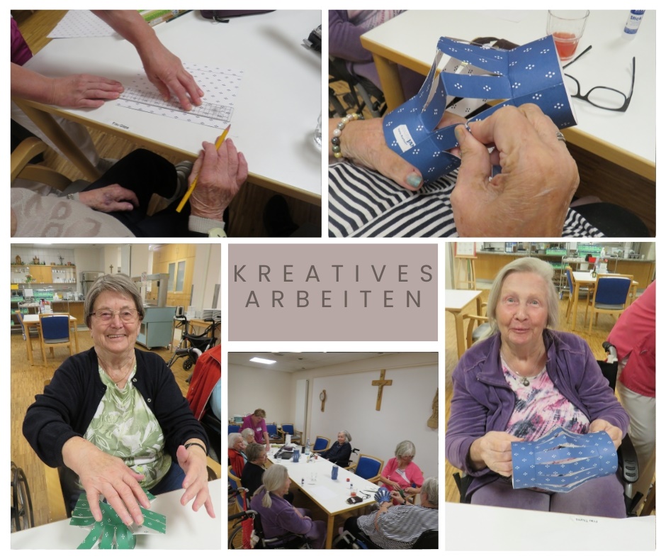 Es ging Hand in Hand an diesem Bastelnachmittag. Eine Bewohnerin zeichnete mit dem Bleistift die Flächen vor, die eine weitere Bewohnerin mit der Schere schneidet. Dann wurde geklebt und fixiert bis am Ende wunderschöne kleine Laternen entstanden.
