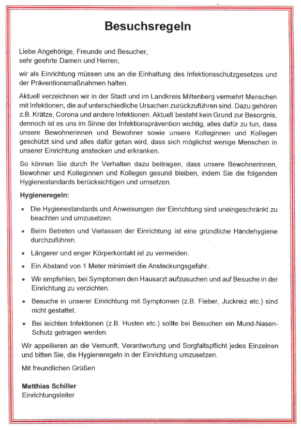 … um unsere Bewohner und unser Personal davor zu schützen, bitten wir Sie, liebe Angehörige, Freunde und Besucher des Hauses Maria Regina, unsere Besuchsregeln, die Sie auch an den Eingängen sehen, zu beachten.