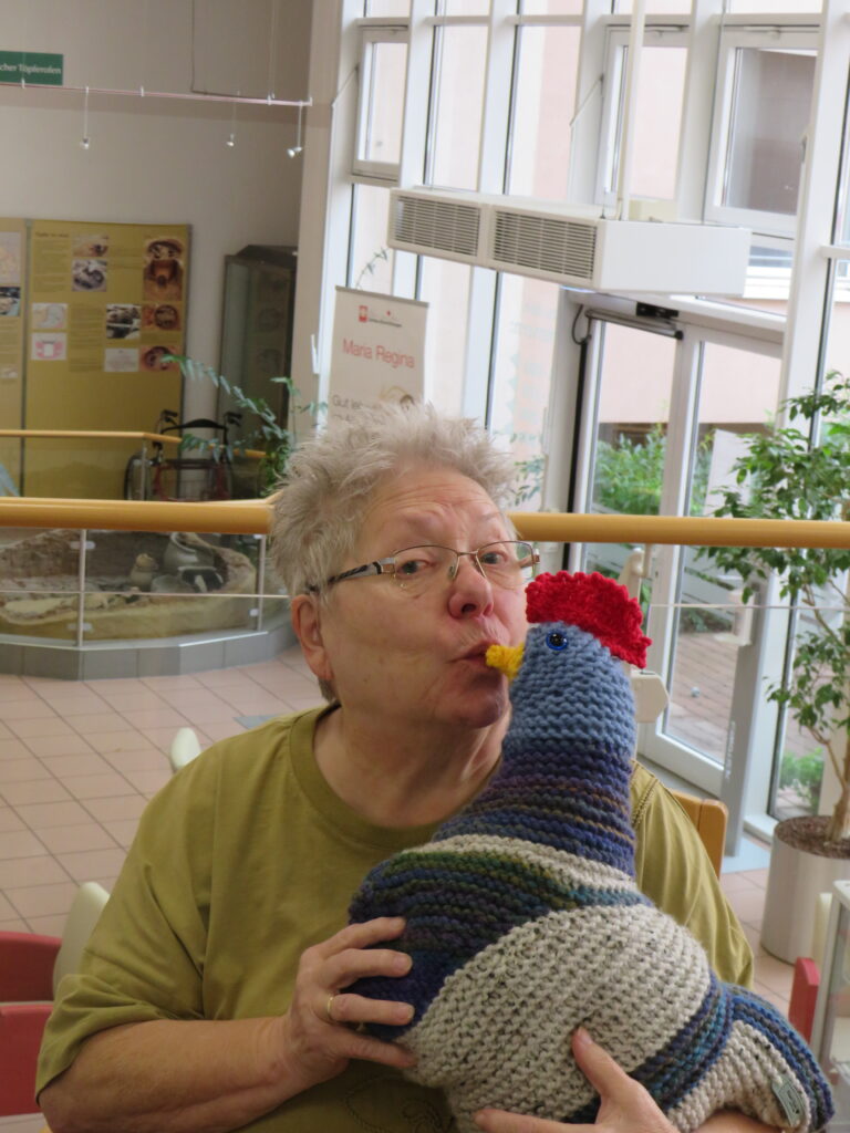 In einer großen Tischgruppe fanden sich die strickbegeisterten Bewohnerinnen zusammen. Sr. Silvia hatte tolle, farbenfrohe Wolle und diverse Stricknadeln im Gepäck. Während einige Teilnehmerinnen sofort loslegten, bekamen andere individuelle Hilfestellung und Unterstützung durch unsere Mitarbeiterin. Sr. Silvia ist selbst strickaffin und brachte auch ihr gestricktes Huhn mit, das allen sehr gut gefiel.