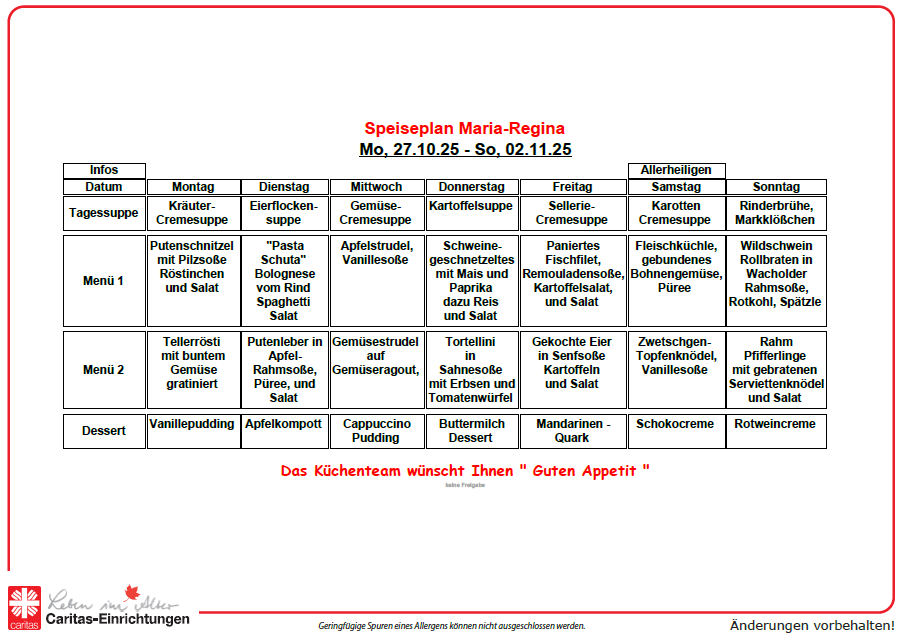 Unser Küchenteam hat für unsere Senioren zum heutigen Sonntag folgendes Menü vorbereitet: