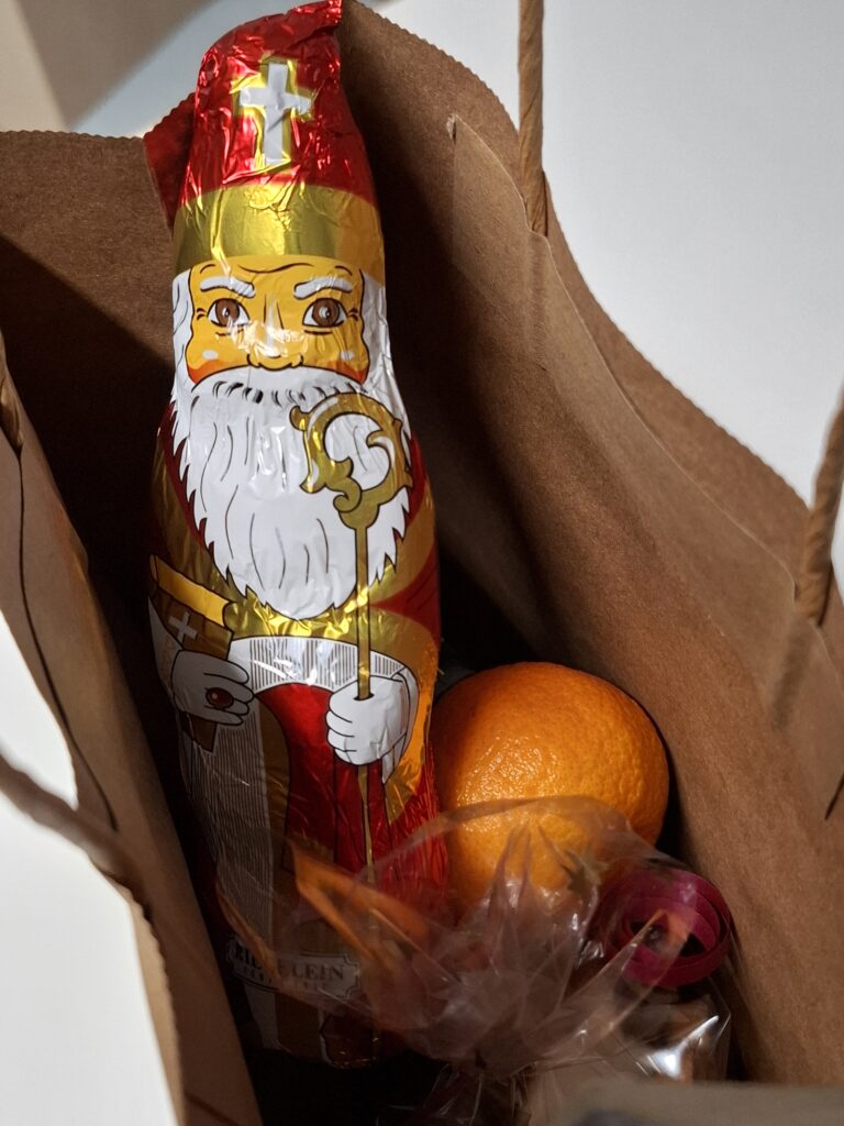 In unserem Haus war es anstelle eines Stiefels eine gefüllte Tüte mit Plätzchen, Mandarinen, Fruchtsaft und einem Schokoladennikolaus, mit der unser „Nikoläuschen Paul“ unsere Senioren in der Pflege erfreute. Unsere MieterInnen im Servicewohnen wurden von unserer Hauswirtschaftsleitung Tina Leonetti und der Verwaltungsmitarbeiterin Carmen Seifried mit der Nikolaustüte überrascht.