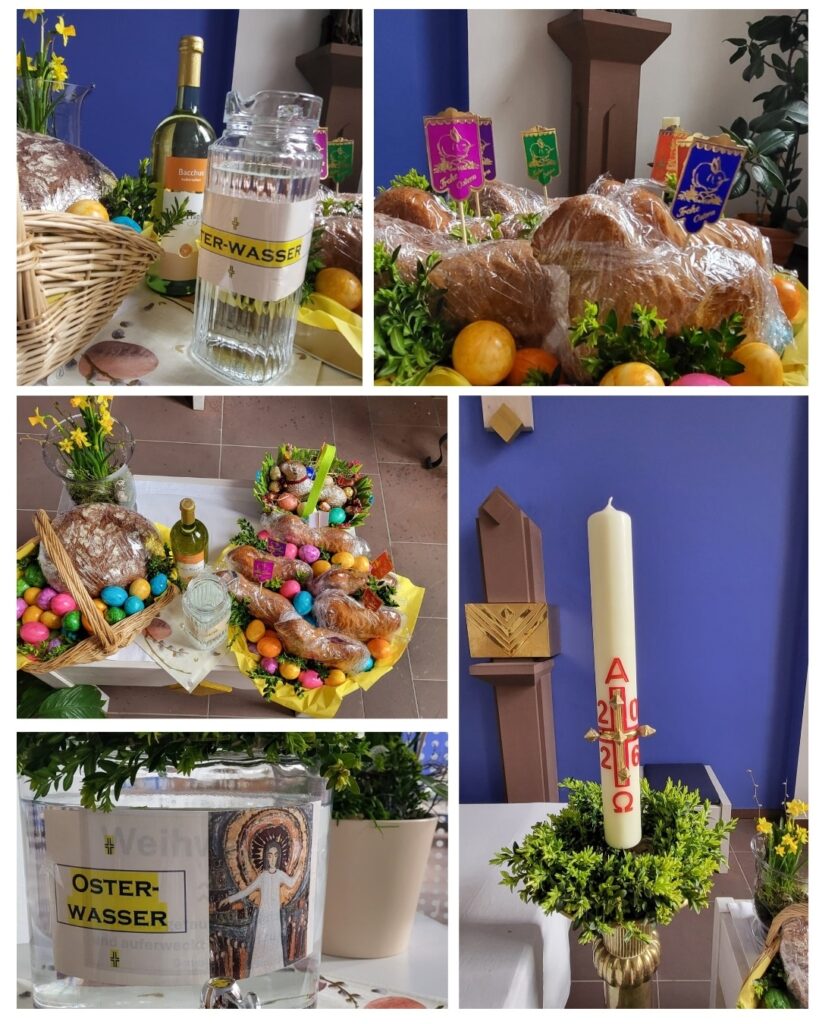 In der Auferstehungsfeier am Nachmittag des Karsamstags wird die Osterkerze entzündet und die Ostergaben gesegnet.