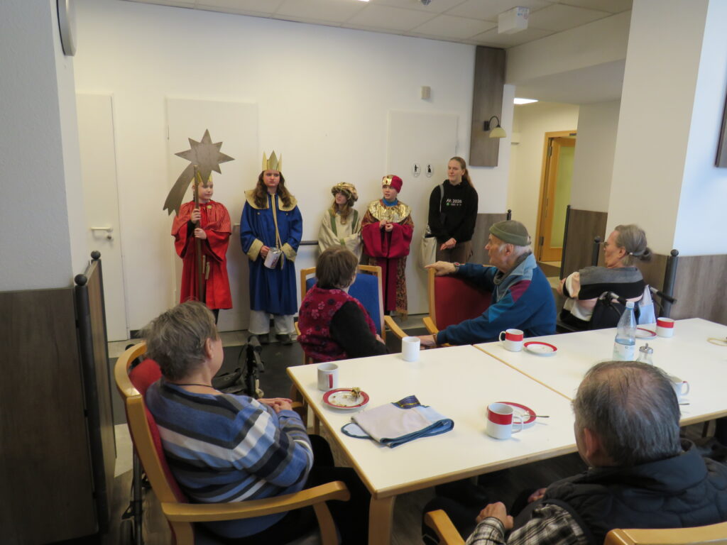Die 3 Heiligen Könige wurden im Haus bereits erwartet und in den Aufenthaltsräumen herzlich begrüßt. Die Könige wurden dieses Mal durch 3 Mädchen im Alter von 10 bzw. 11 Jahren verkörpert. Trotz ihres jungen Alters meisterten sie ihre wichtige Aufgabe sehr gut und so wurden neben Geldspenden für die Spendenaktion auch noch Süßigkeiten für die Mädchen durch unsere Bewohner/innen gegeben.