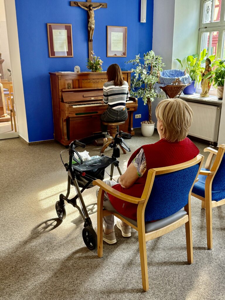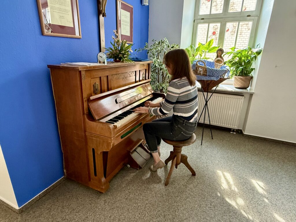 Gestern traf sie dann unseren Einrichtungsleiter an, der den Wunsch sehr gern erfüllte. Kaum hatte er und Frau Schindler Platz genommen erfüllte sich der Raum mit wunderbaren Klängen. Schnell war klar: Hier sitzt keine Anfängerin an den Tasten.