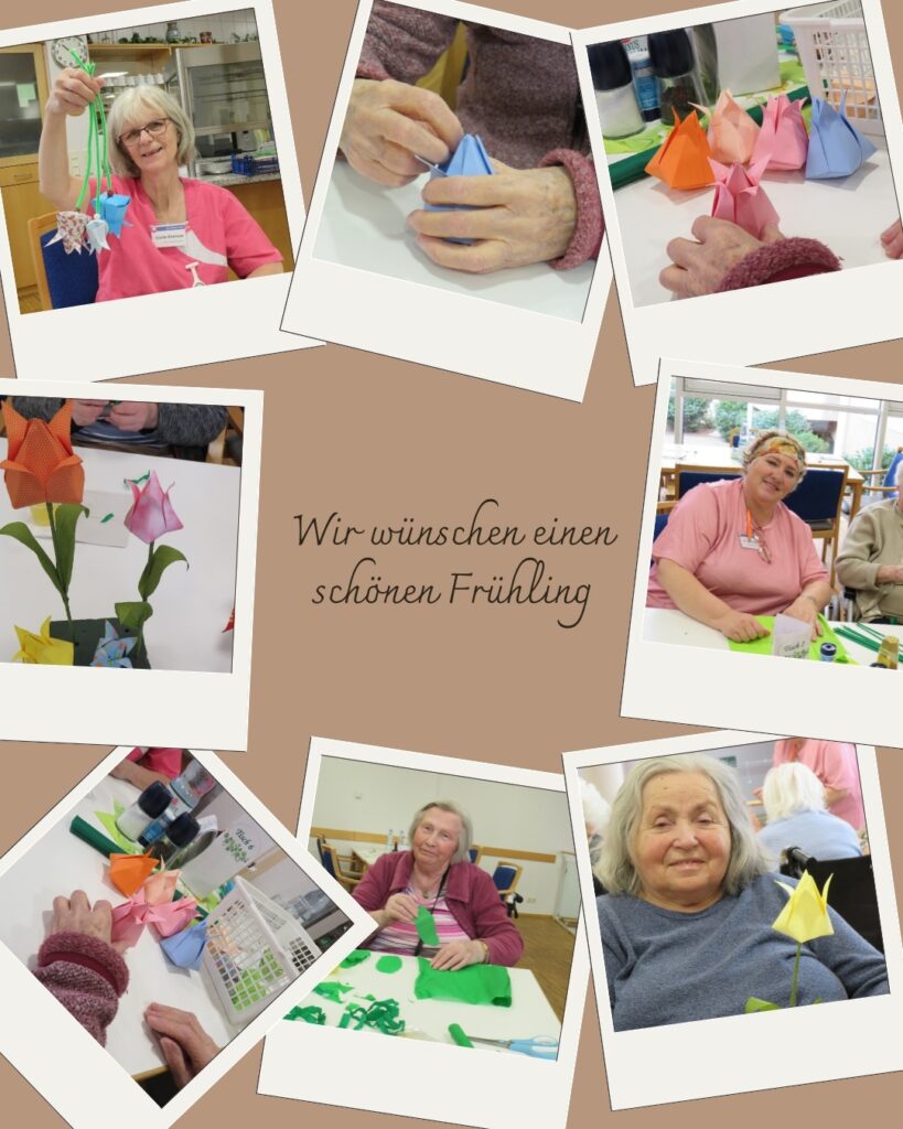 Zusammen mit Betreuungsmitarbeiterin Silvia Schneider wurde mit den Bewohner/innen in einer großen Gruppe gefaltet, geschnitten und geklebt, so dass die Zahl der schönen Blüten rasch wuchs.